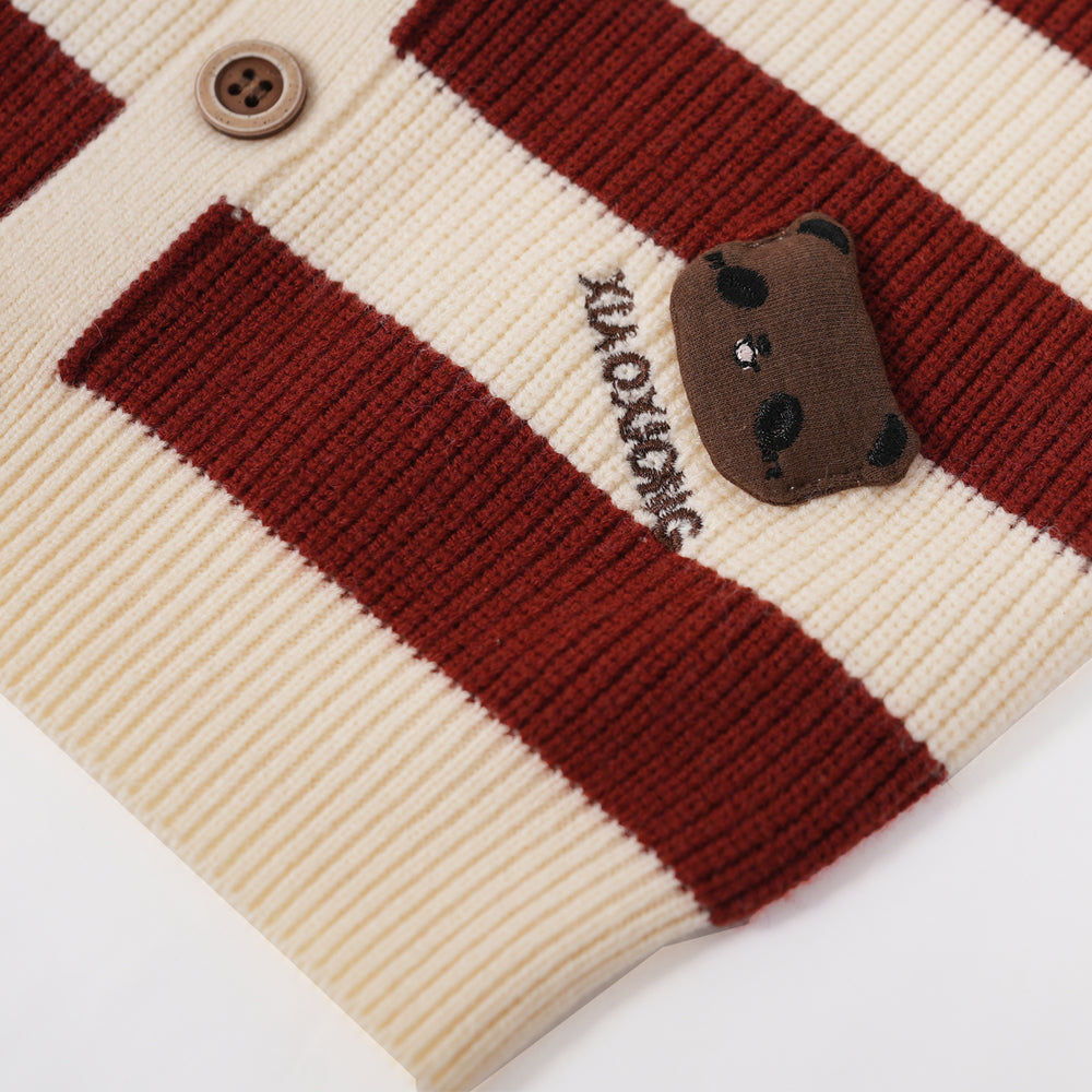 A cozy knit cardigan featuring bold red and cream horizontal stripes. It’s detailed with cute panda face patches and playful embroidery, making it an adorable everyday piece. The front button closure adds comfort and ease for layering in cooler weather.